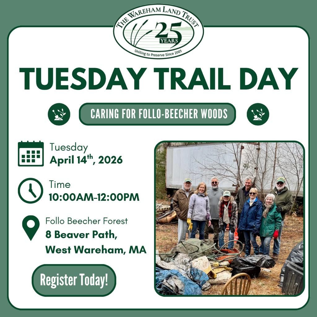 Join the Wareham Land Trust on Tuesday April 14th, at the Wareham Land Trust’s newly acquired property, the Follo-Beecher Woods. We will be doing an invasive plant removal and trash clean up. We will meet at 10am and work until about 12pm.