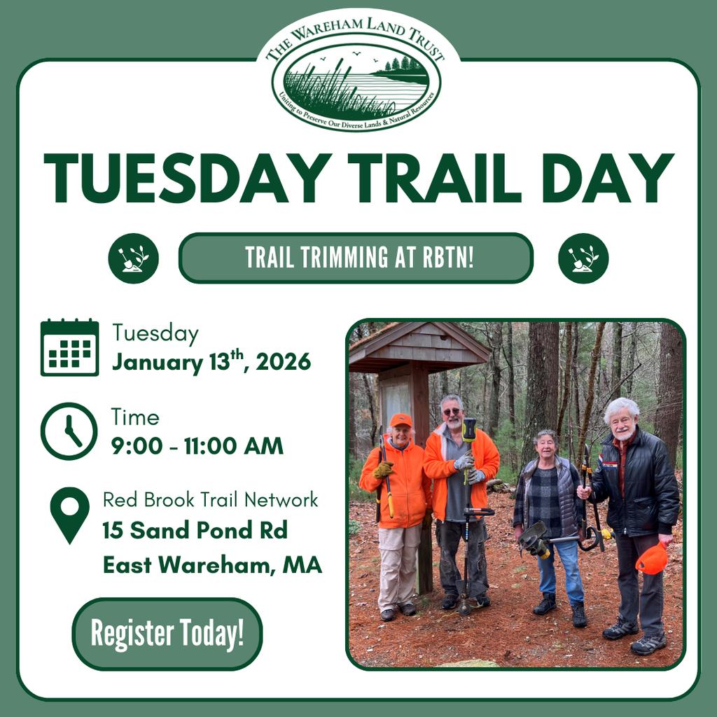 Join the Wareham Land Trust on Tuesday January 13th, at Red Brook Trail Network for clearing of over growth brush and general trail maintenance. This event requires registration.